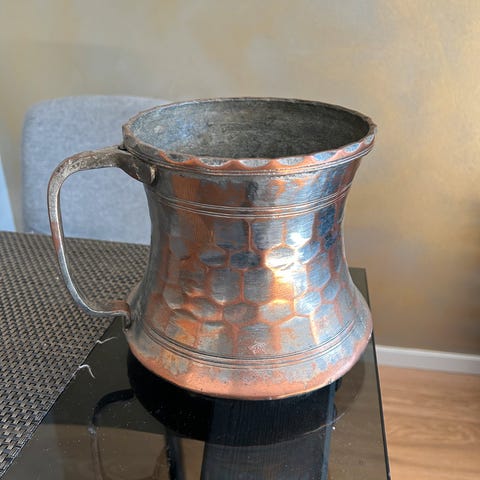 Fire kobber dekorasjoner: en munkepanne, en puddingform, en fisk og oppheng til blomster. Selges samlet 200 kr. Alt er helt strøkent og nypussa. Vet det er kjøpt på 1970-tallet, antagelig på Husfliden i Oslo eller Husfliden i Elverum. Kan sendes med PostNord til 69 kr.