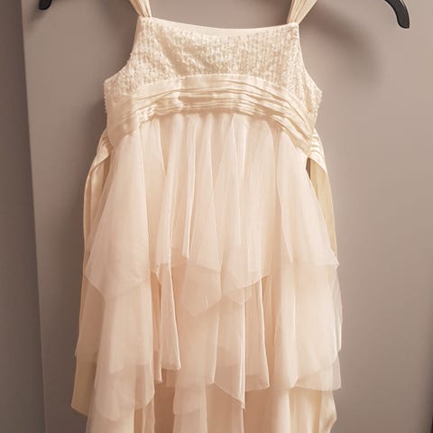 Kjolen til fest selges til halvpris, str.S (EU 36-38) , passer til 158-164 høyde, av GERARD DAREL (made in France ). Toppen er 100% silke. Farge er fersken(ikke rosa). En unik og delikat kjole.