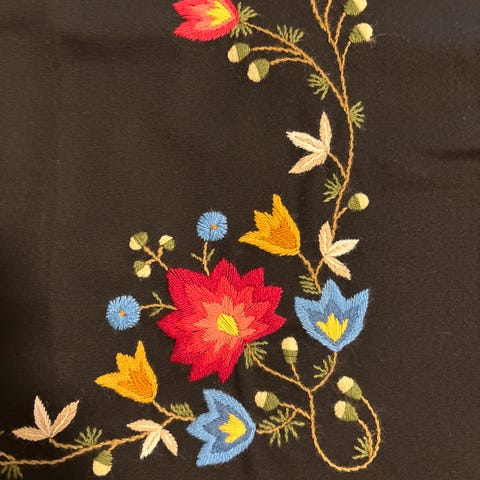 Sort ullstoff, broderi i friske farger.
