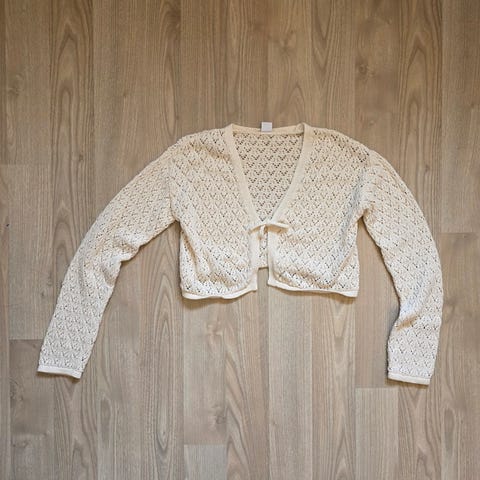 En flott hvit cardigan til jente (str. 152cm). Lange armer, heklede enden på armene kan brettes opp ved behov. Bomull.