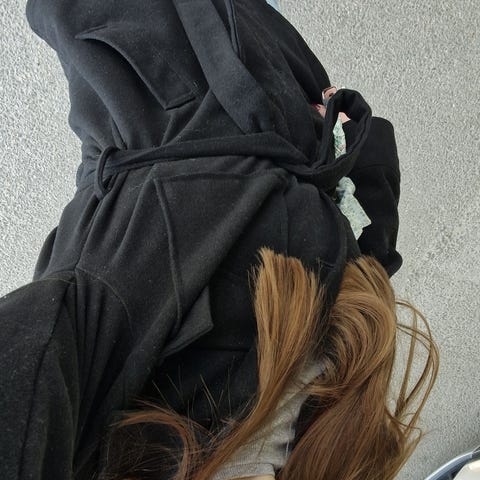 Lang strikkekåpe fra BikBok. Modell Laura.