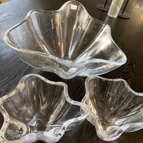 Flott og tung glass skål eller krystall som kan brukes til te lys eller som en skål. Flott design! Fremstår som ny. 13X13 cm. Stor og god tyngde. Kvadratisk.