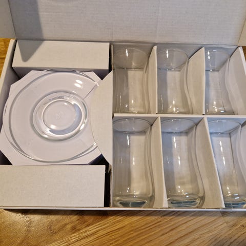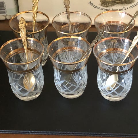 Tesett i glass med gullkant selges for 50 kr. Brukt, med riper. 3 stk. teskjeer følger med.