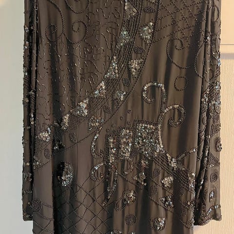 Brun fest-topp med paljetter og glidelås i ryggen. Lengde 75 cm. Brukt få ganger og er nesten som ny. Nydelige sjatteringer i brunt.
