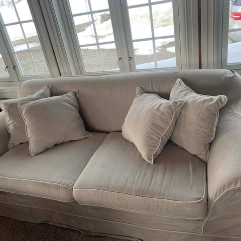 Sofaen og stolene er meget pent brukt, ingen slitasje-merker eller misfarging. Innhold i putene er dun. Fargen er lys beige. Sofa og stoler er fra Slettvoll.