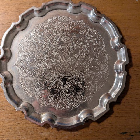 Eldre fat med dekorativt mønster i metall. Litt usikker på hva slags metall. Ikke vært pusset på lenge. 29 × 40 cm langt og bredt.