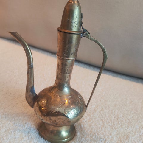 Eldre tekanne i messing laget i India, med solid trehank. Tekannen står på tre bein under tekannen. 20 cm i diameter på det bredeste og 18 cm høy under hanken.