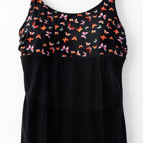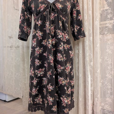 • Svart med blomstrende "volanger" nederst bak og på sidene - samme stoff/mønster øverst på ryggen