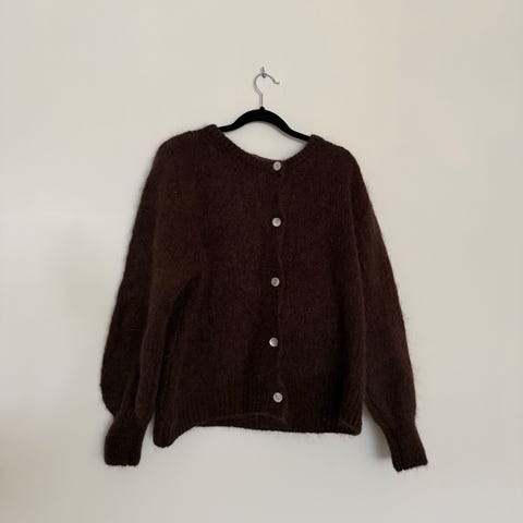 Selger en lang sort mønsterstrikket cardigan fra BCBG. Lange ermer, belte i livet, V-hals, knapper forran.