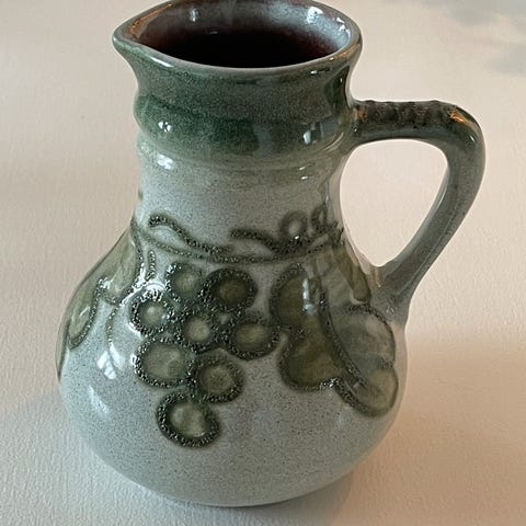Kjeramikkvase med hank. Høyde 20 cm. Diameter i bunnen: 11,5 cm.