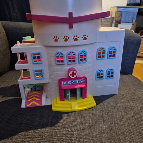 Dyresykehus i sterk papp til å bygge, dekorere med klistremerker og leke med. Sett inneholder dyresykehus, 7 dyrefigurer og klistremerker. Ny i original emballasje, fra www.caspeland.no