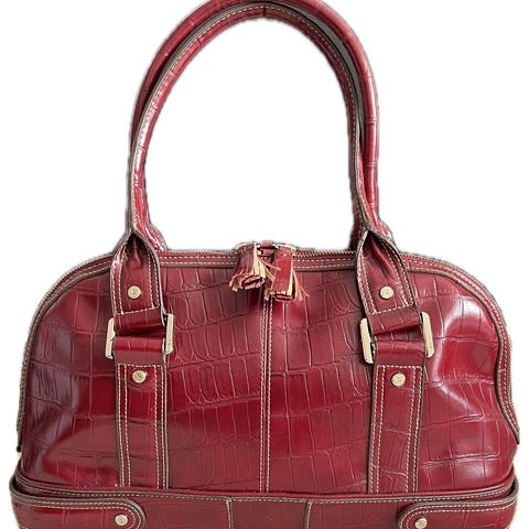 Brun Liz Claiborne skulderveske i polyester. To ytterlommer, hvorav en med glidelås. Tre innerlommer, hvorav en med glidelås.