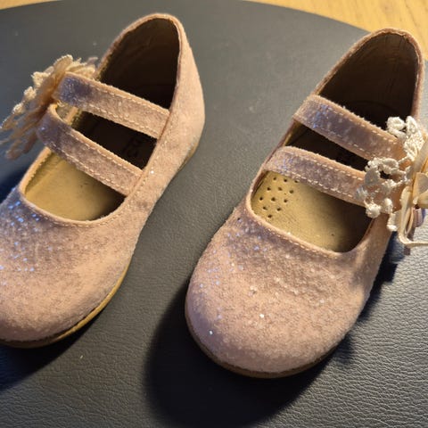 Barnesko med rød tekstil og beige sløyfedetaljer størrelse 24 for jente