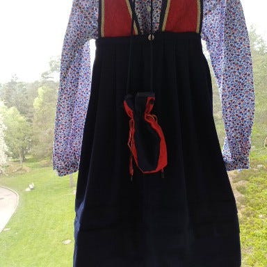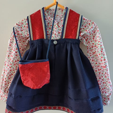 Str 6-10 år, kan legges inn og ut. Sist brukt av slank 10-åring. Sydd på kurs, stoff fra Lom Husflid. Lengde skjørt 73 cm. + 10 cm.
