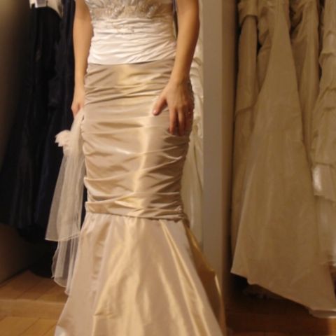 Eksklusiv skreddersydd kjole båret av Dorthe Skappel på Gullruten selges. Kjolen er designet av Karina K Titze fra Undorn. Den er laget av dobbeltvevet silke med blondebesetning med slep og stort underskjørt. Kjolen er i størrelse 38/40. Kjolen er krøllete etter lagring og bør renses.