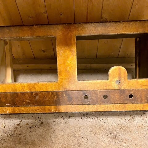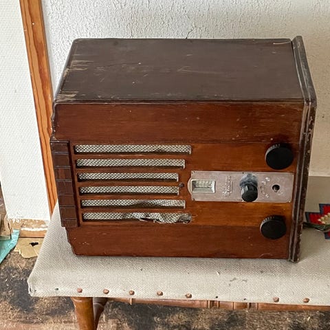 Flott, gammelt radioskap med platespiller. Har ikke testet det på noen år, men det har fungert fint tidligere. Pent, men med noe lakkskade på toppen. Ett ordentlig kult retro møbel med funkis design.