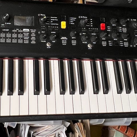 Avansert synth, men har også følelsen av vanlig piano, med god vekting på tangenter, og fin pianolyd (-er). selges med sustainpedal og stativ.