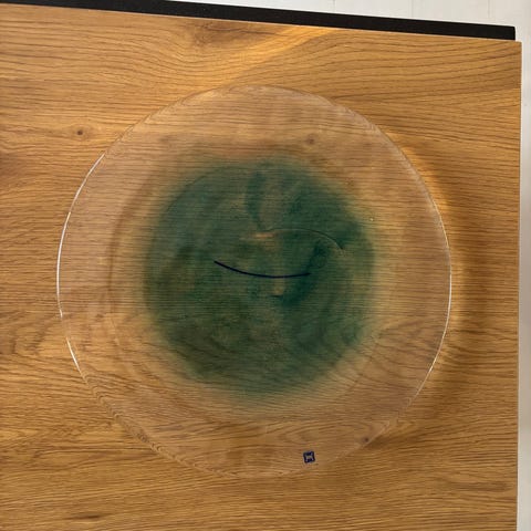Jeg ønsker meg flere dekketallerkener i samme serie som jeg har fra før. Derfor ønsker jeg å kjøpe dekketallerken/fat i glass, lik den på bildet.
