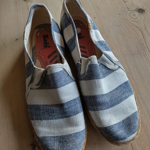 Stripete blå/rød/hvite i str. 36.