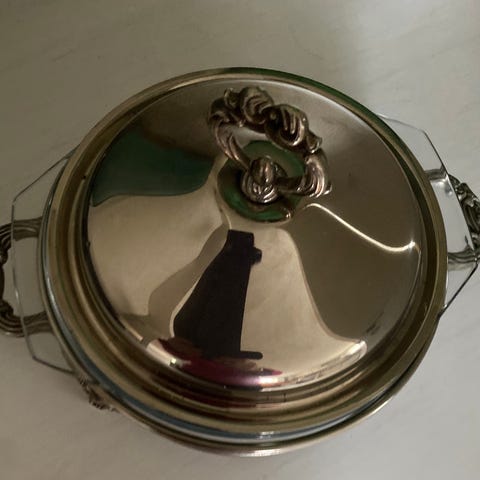 Meget pent brukt ildfast form, med stativ i sølvplett.