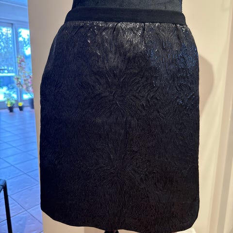 Lekkert og spesielt skjørt fra DRANELLA i str. 38. Strikk i livet og glidelås på siden. Skjørtet er spekket med "flak" som ser ut som dråper og som gir et fint skinn til skjørtet. Som nytt!
