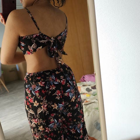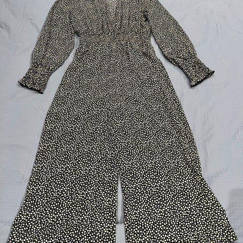 Superfin jumpsuit i blomstermønster i silkeimitasjon. Smal i modellen, lukkes med glidelås bak. Jumpsuiten er aldri brukt, og er størrelse S. Materiale: 100% polyester. Jeg sender stort sett alltid første virkedag etter mottatt penger for frakt :)