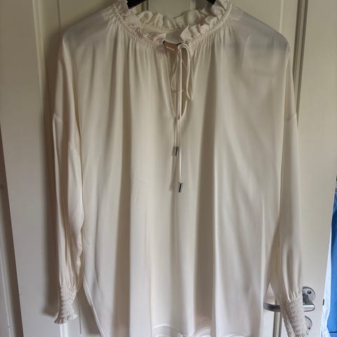 Superfin bluse/topp i en klassisk kremfarge. Blusen er aldri brukt, og er størrelse XS. Materiale: 100% viskose. Jeg sender stort sett alltid første virkedag etter mottatt penger for frakt :)