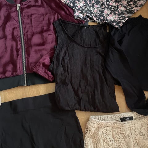 Bilde 1: Lilla topp med sorte blonder M 100 kr Solgt og svart kjole med strass stener S 300, Bilde 2: Turkis leopard jakke L Solgt, Lilla bukse 44 Solgt