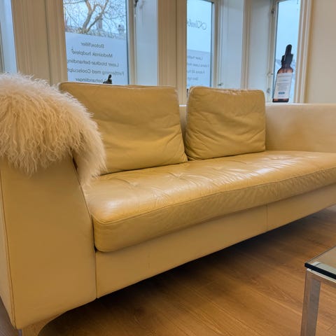 Riviera sofa, lite brukt, utstilling og pyntegjenstand. Ein manns hushald. Har blitt litt misfarge på sitteputene, sannsynlegvis pga at har nytta saueskinn som beskyttelse og lyset har gitt litt misfarge. Ser det på siste bilde.