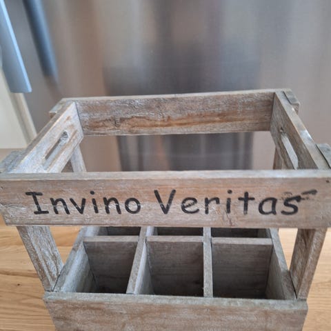 Har en gammel treverk kasse for vin. Pent brukt . Er litt ødelagt på kanten, men det kan limes. Så er den i stand. .