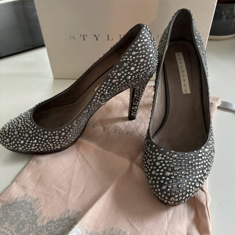 Til nyttårsfesten?! Nydelig sko, sort med «diamanter». Kun brukt to ganger. Høyde hæl: 8 cm. Selges grunnet tåskade. Pris nye 2000kr.