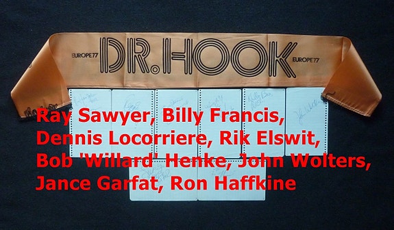 1977 - Autentiske autografer av Dr. Hook + "Silke" skjerf m/trykk to sider.