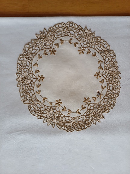Ny håndbrodert brikke fra Madeira. D: 27 cm.