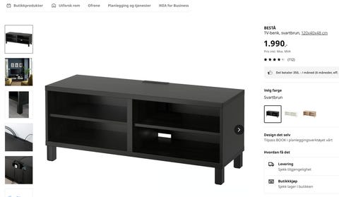 Antikviteter og kunst (338)Dyr og utstyr (23)Elektronikk og hvitevarer (743)Foreldre og barn (6 114)Fritid, hobby og underholdning (298)Hage, oppussing og hus (2 444)Klær, kosmetikk og tilbehør (169)Møbler og interiør (42 742)Næringsvirksomhet (258)Sport og friluftsliv (31)Utstyr til bil, båt og MC (17)