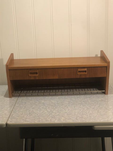 Teak vegghylle med skuff