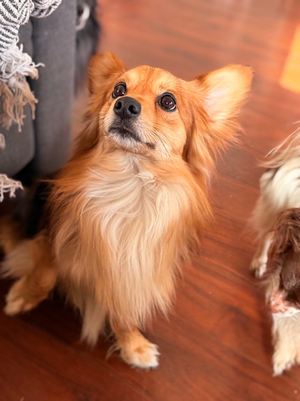 Liten søt svart med litt hvitt på brystet, langhåret Chihuahua tispe 🐕❤️