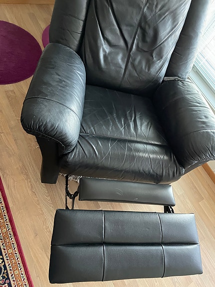 Svart recliner lenestol i skinn med fotskammel