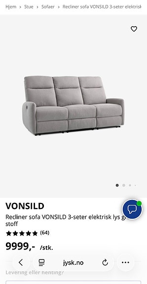 Recliner sofa 3-seter (elektrisk) – lys grå, veldig komfortabel