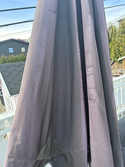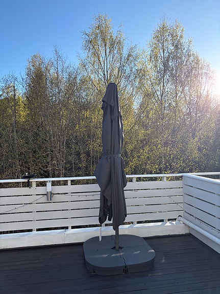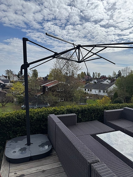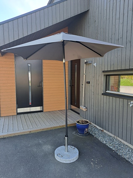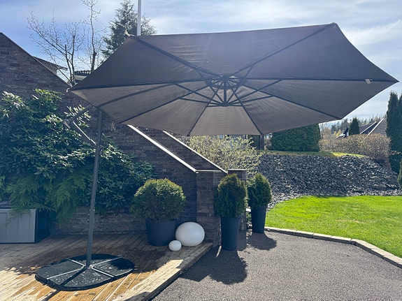 Stor grå parasoll til hage/terrasse