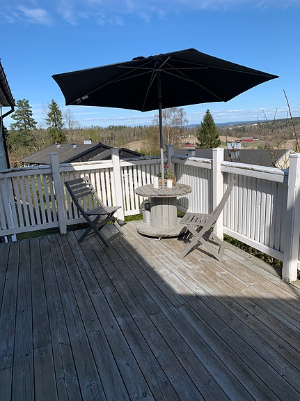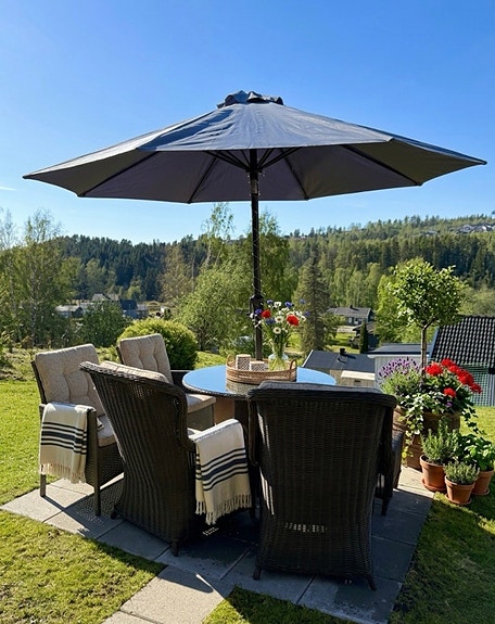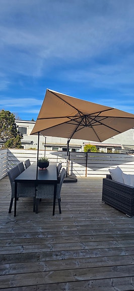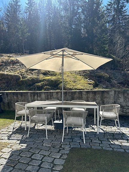 Utebord med 6 stoler og parasoll