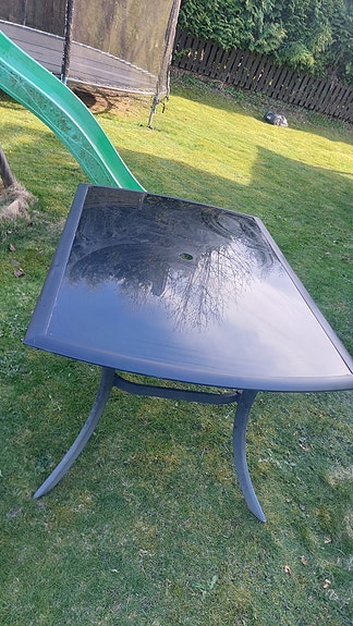 Utebord med glassplate og hull til parasoll