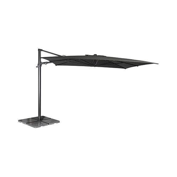 Grå hengende parasoll med kryssfot og vekter
