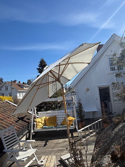 Hvit parasoll med trestang til terrasse/hage