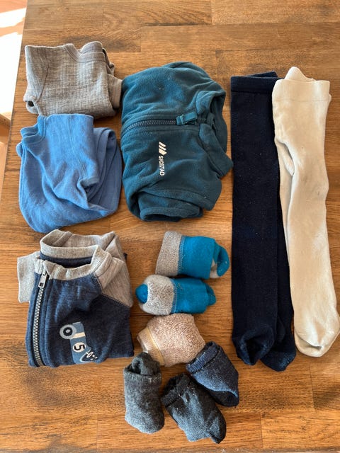Klespakke 116-122 (4-6år) med Hestra votter,skalljakke,regnkåpe og ull
