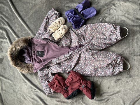 Jente Bobledress str. 80, fotposer m/fleece og 2 par foret votter