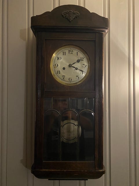 Veggklokke med pendel.
