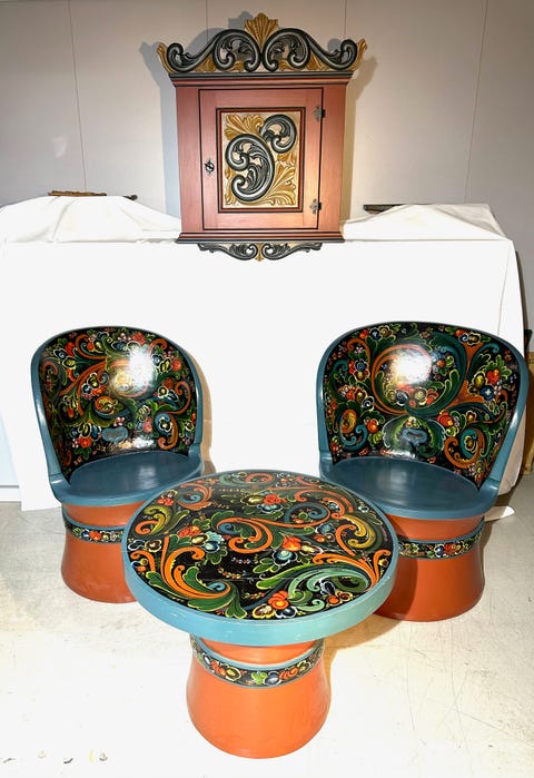 Rose malt Kubbestol og tre bord