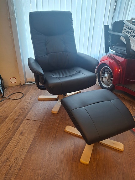 Jysk Hundslund lenestol med fotskammel svart kunstskinn bjørk