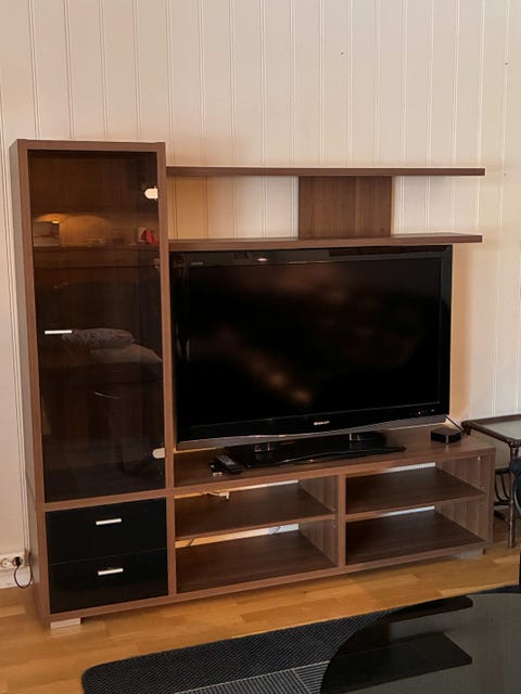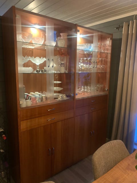 Hjørnesofa og vitrineskap