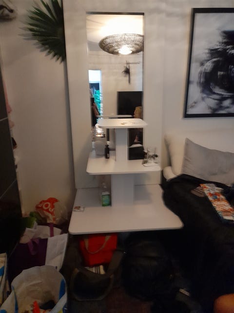 Høy glass hylle gis bort